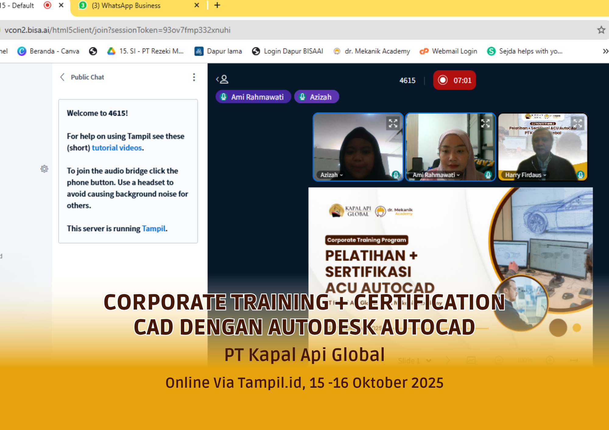 Program Pelatihan dan Sertifikasi Internasional Autodesk Certified User (ACU) – AutoCAD untuk PT Kapal Api Global telah dilaksanakan pada 15–16 Oktober 2025 secara online melalui platform video conference Tampil.id. Kegiatan yang diselenggarakan oleh Dr. Mekanik Academy ini bertujuan untuk meningkatkan kompetensi peserta dalam penggunaan Autodesk AutoCAD sebagai perangkat desain berbasis CAD.